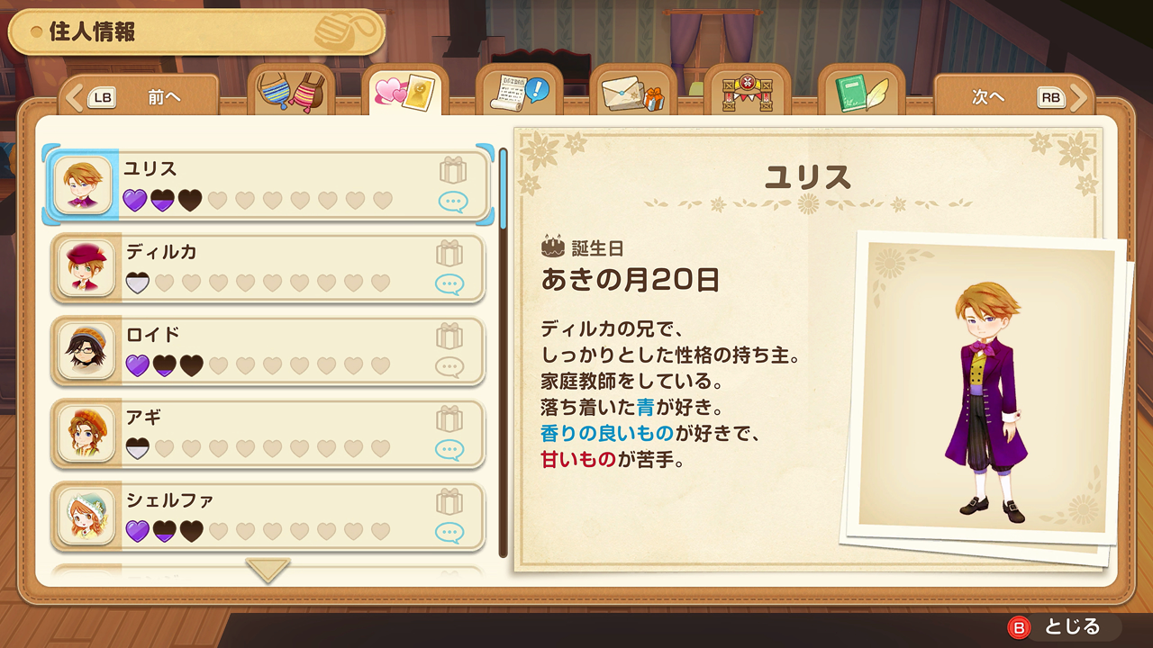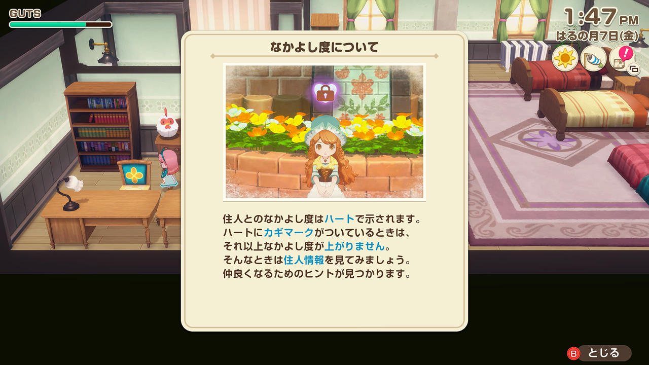 주민과의 친밀도는 하트로 표시됩니다.