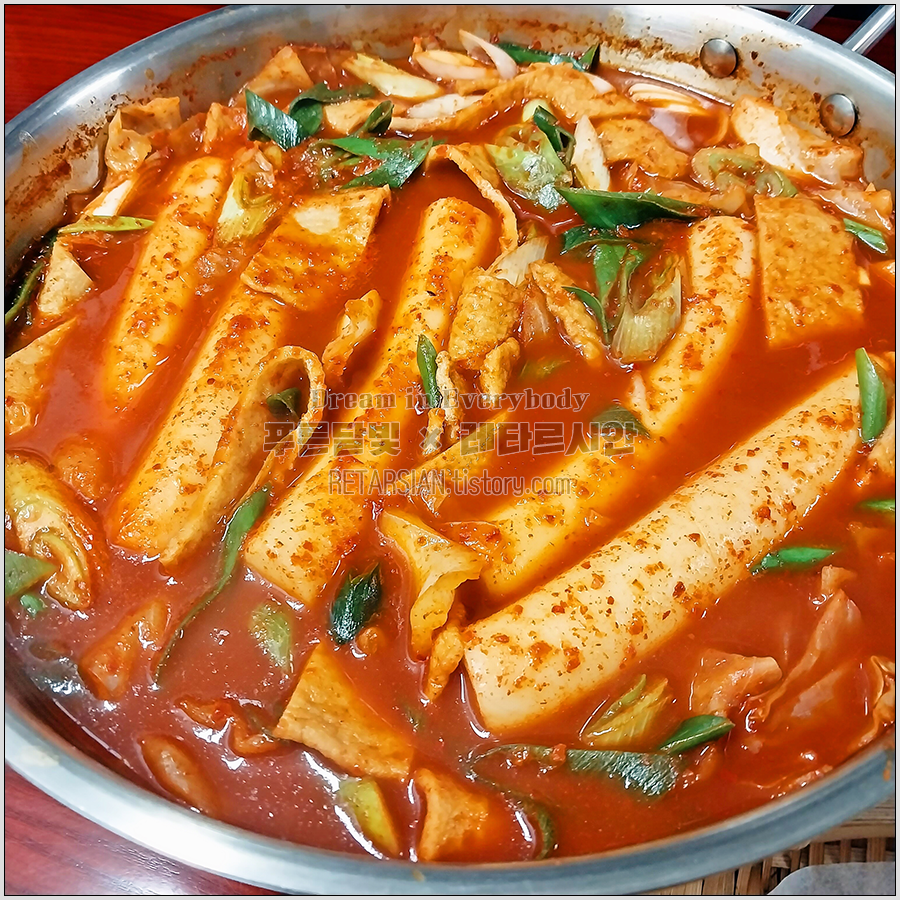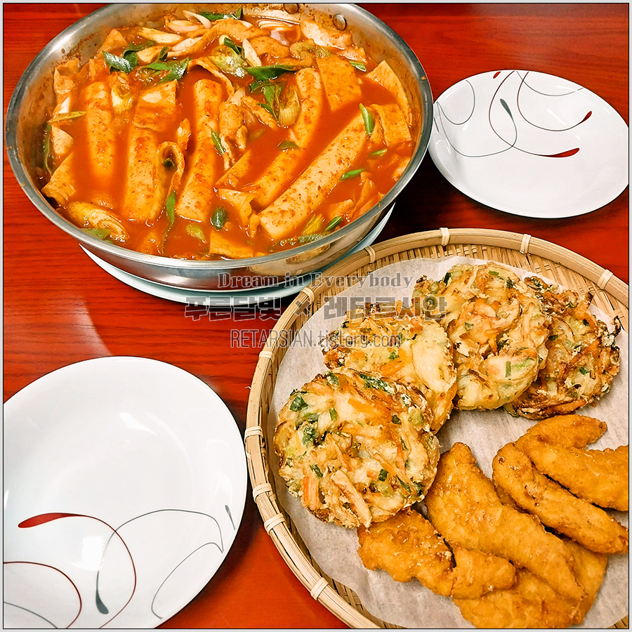 채소튀김과 치킨텐더를 사이드메뉴로 했던 날의 떡볶이 한상 차림.