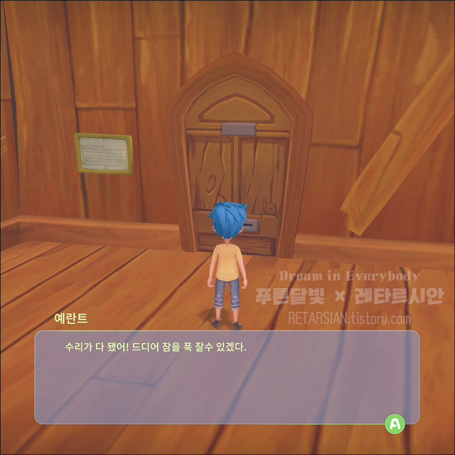 음… 텐트 아닌 걸 다행이라고 해야 하나…? 어쨌든, 수리가 시급하다. 자는 내내 무너진 틈새로 바람이 들어와 잠을 설친 듯한 우리 예란트를 위해 하루빨리 수리해주기로 결심. ── 그 전에, 포샤에 도착하자마자 예란트에게 퀘스트를 준 상회의 ‘프레슬리’에게 가서 간단하게 ‘돌 도끼’와 ‘돌 곡괭이’ 퀘스트를 완료.