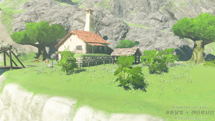 ■ 젤다의 전설 브레스 오브 더 와일드 ■ ■ 젤다의 전설 야생의 숨결 ■ 하테노 마을에 자리 잡은 미야마·가나의 사당에서 가까운 곳, 다리 건너 마을과 동떨어진 곳에 오랜 시간 동안 아무도