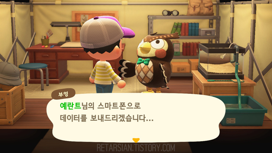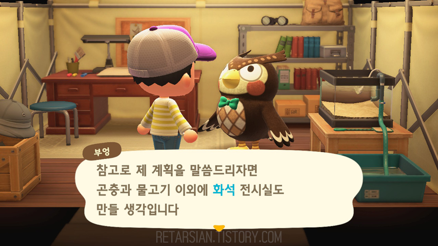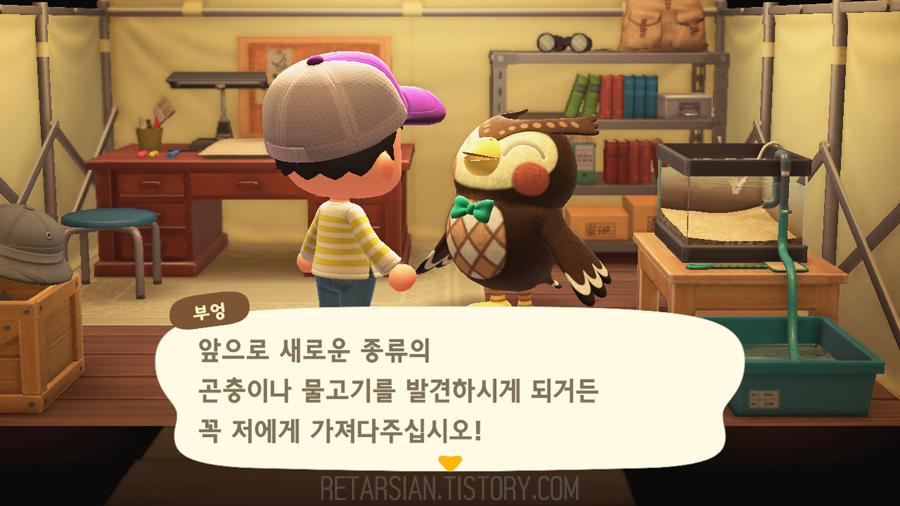 이제 이 도구들로 열심히 화석도 파고 물고기도 잡고 곤충도 채집하고 해서 부엉에게 가져다주면 된다.