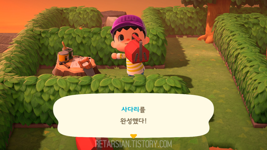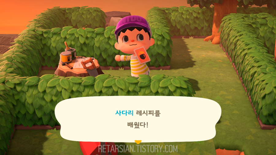 나중에 안 사실이지만, 이 사다리의 DIY 레시피를 얻으려면 박물관 건설, 상점 건설 후 3명의 주민이 추가로 이사 오게 될 때, 다리 설치하고 집터 정하고 이런 식으로 해야 너굴에게서 얻을 수 있다는 모양이다.