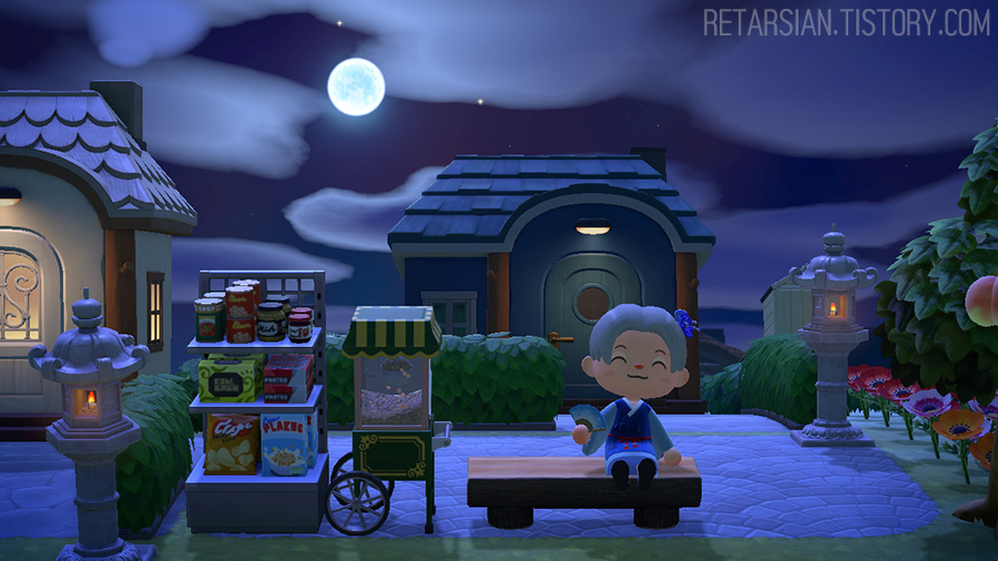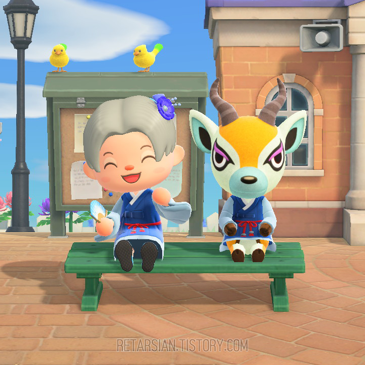 그리고 평소에 두루마기 한복을 자주 입고 섬을 돌아다니는 느끼 주민 톰슨이 마침 안내소 앞 광장에 앉아있길래 잽싸게 곁에 앉아 또 한 컷! 벌써 꽤 오래된 일이라 자세히 기억나지는 않는데… 라온제나도의 주민 중 하나가 선물한 저 두루마기 한복이 마음에 든 건지, 톰슨이 정말 수시로 입고 다녀서 뭔가 더 정이 갔던.