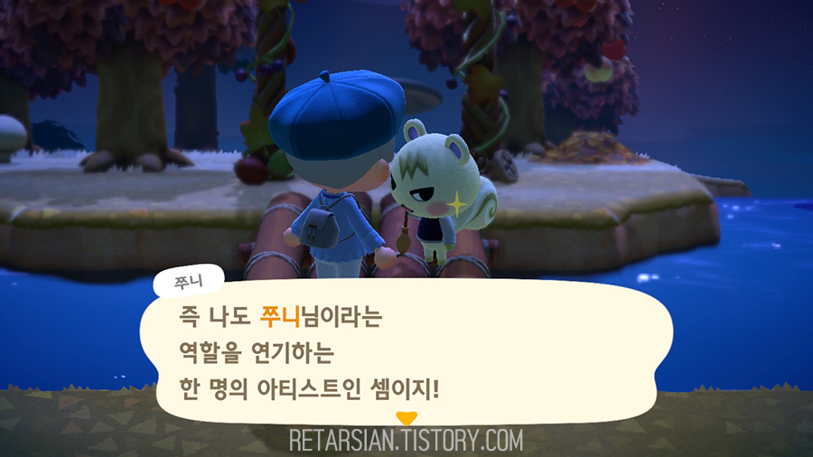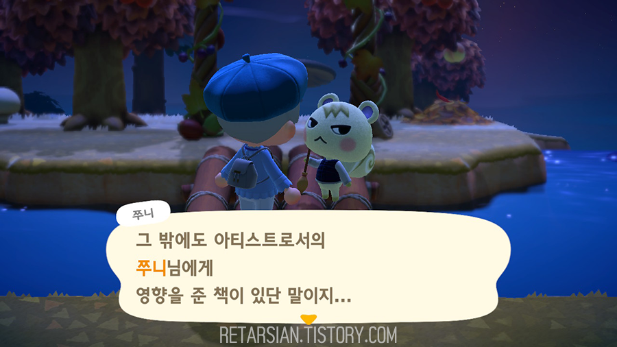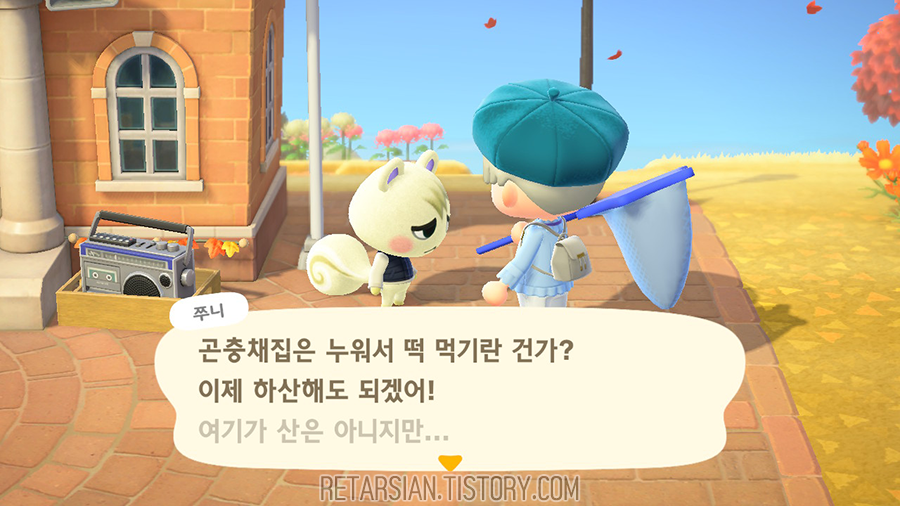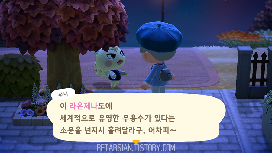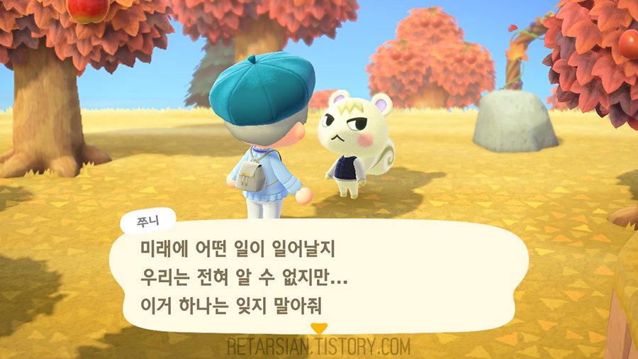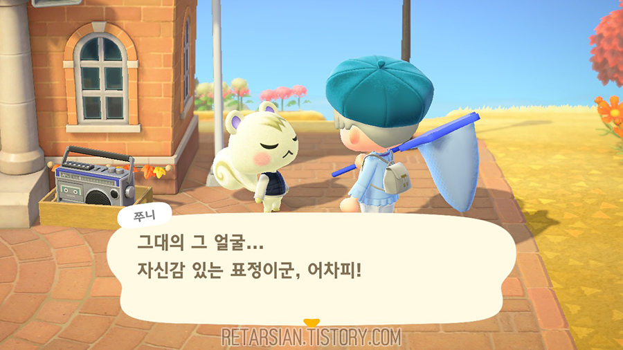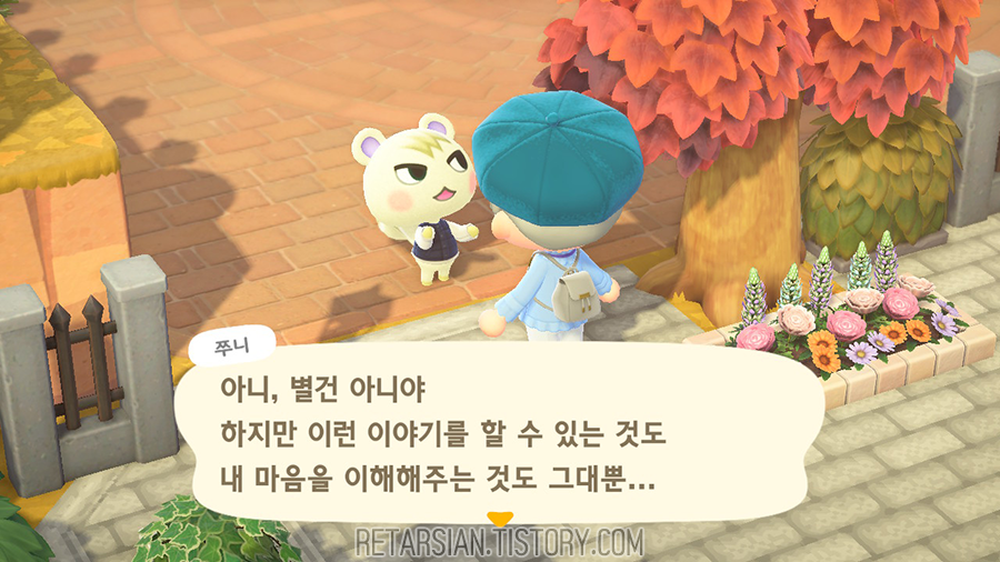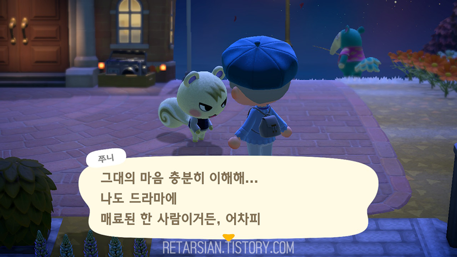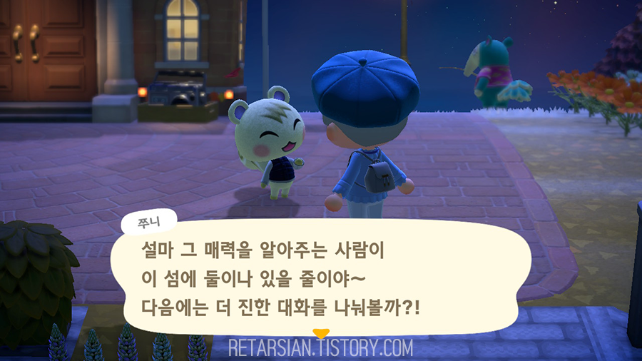 느끼 주민 답게 쭈니 는 일단 상대방의 장점을 찾아 서슴없이 칭찬하는 점이 귀엽고 멋진 것 같다. 물론, 또 다른 느끼 주민인 톰슨 도 그렇고 라이오넬 도 그랬었지만… 같은 대사라도 톰슨 이 했던 대사와 쭈니 가 하는 대사의 느낌이 뭔가 다르게 받아들여지는 기분이라 새롭기도 했다.
