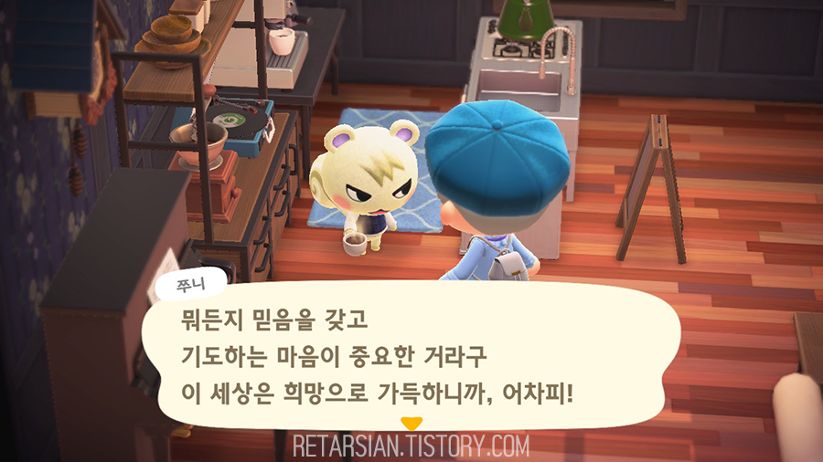 ── 솔직히, 우리 섬에는 쭈니 이전에 느끼 주민이 톰슨 과 이미 이사 간 라이오넬 까지 둘이나 있었기에, 쭈니 가 하는 대사들은 대부분 상당히 익숙한 대사들이었지만, 같은 말을 해도 누가 말을 하느냐에 따라 그 뉘앙스나 분위기, 느낌, 받아들이는 의미까지 꽤 달라질 수 있기에 딱히 의미 없는 행위는 아니었다고 본다.