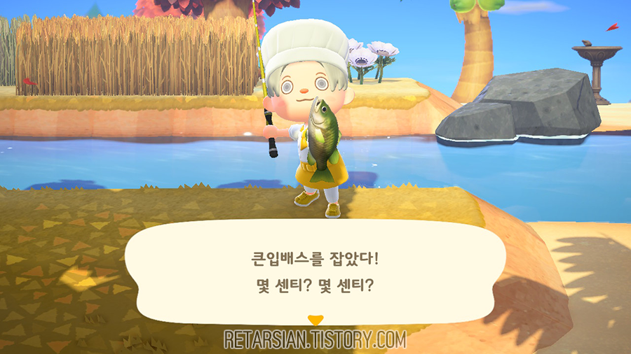 이후, 감자를 어떻게 얻을까 그냥 창고에서 꺼낼까 받에서 뽑을까 생각하며 걷던 중, 순간 강에서 큰입배스가 확실해 보이는 그림자를 발견!! ── 잽싸게 다가가 침착하게 낚싯대를 드리웠다.