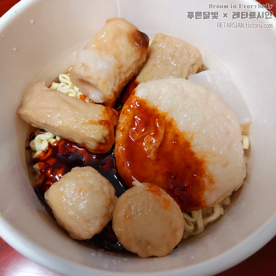 게다가 내가 도중에 실수한 게 있는데, 어묵탕을 나도 모르게 습관처럼 따뜻하게 데운 후에 컵라면에 부어주어서 뭔가 좀 오버쿡된 듯한 그런 느낌이 많이 들었다. 어묵도 오버쿡, 면도 오버쿡…