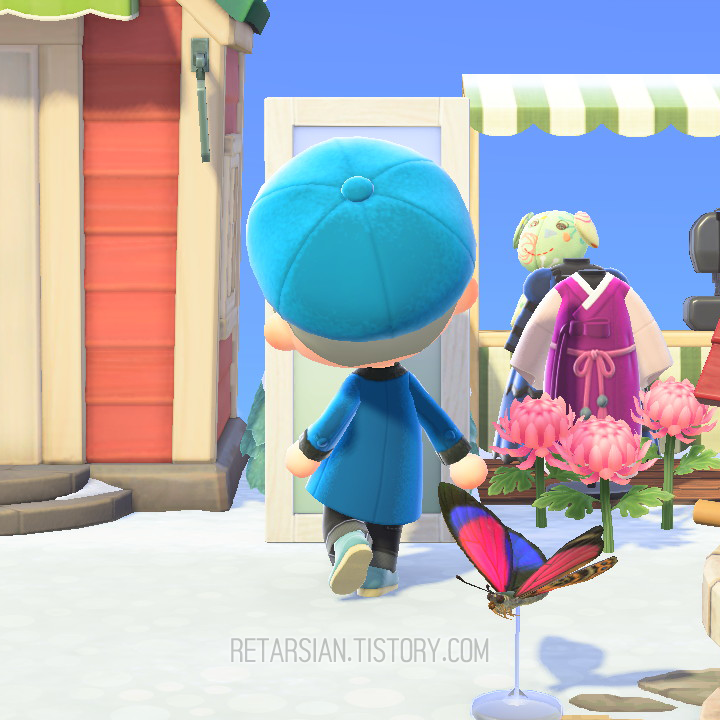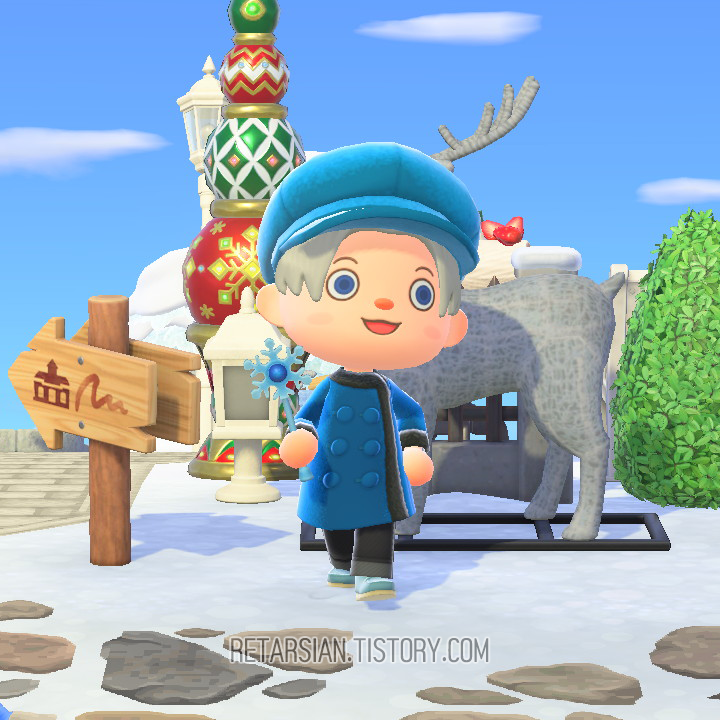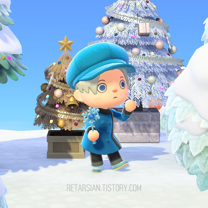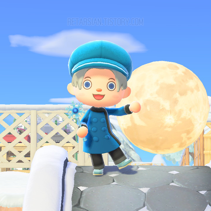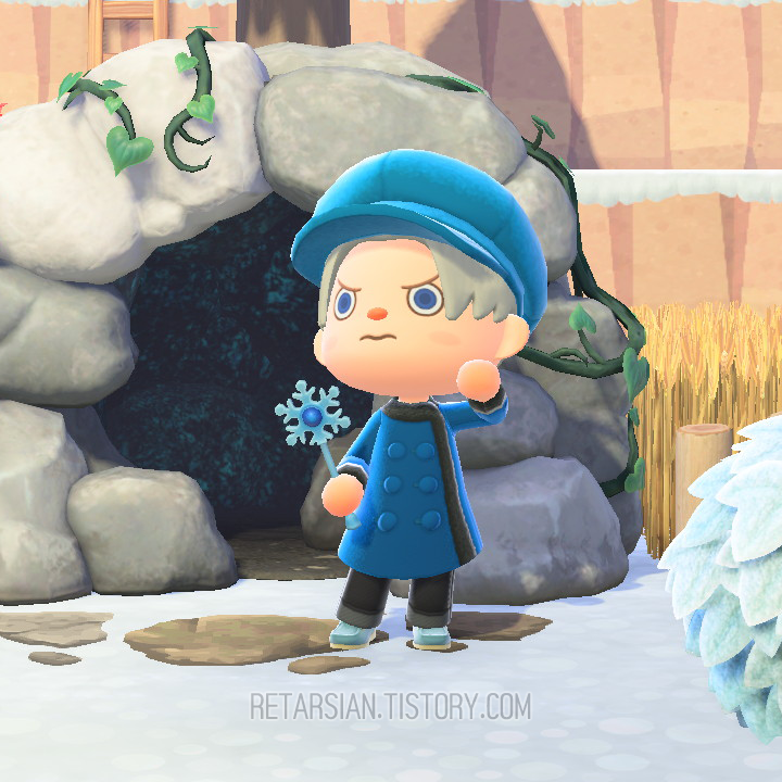 사실, 계절이 변할 때마다 그 계절과 어울리는 지팡이의 레시피를 얻게 되는데, 그래서 나도 계절이 바뀔 때마다 지팡이를 바꿔주는 식으로 플레이해 왔다. ……겨울이 되어 눈사람을 만들게 되니 얼음 지팡이의 DIY 레시피를 획득하게 되었고, 덕분에 요즘은 그걸로 예란트 를 변신시키는데, 마침 이날 코디의 메인 컬러가 뭔가 얼음 지팡이와 잘 어울리는 듯해서 지팡이를 소품처럼 들고 사진을 찍어보았다.