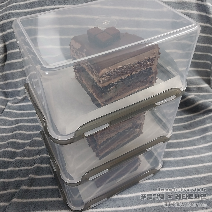 원래는 케이크 보관 전용의 커다란 글라스락이 있었는데 그걸 깨 먹는 바람에 작은 사이즈의 락앤락에 각각 보관하는 수밖에 없었다. ── 깨진 글라스락이 진짜진짜 아까운 게, 요새는 글라스락이든 락앤락이든 용량이 조금만 크면 뚜껑이 손잡이가 달려 판판하지 못한 뚜껑을 달고 나오기 때문에 케이크 보관으로는 적당하지 않다. 그래서 용량이 크고 뚜껑 판판한 걸 찾으려면 발품을 좀 팔아야 하는 지경이 된… ( •́ㅿ•̀ )