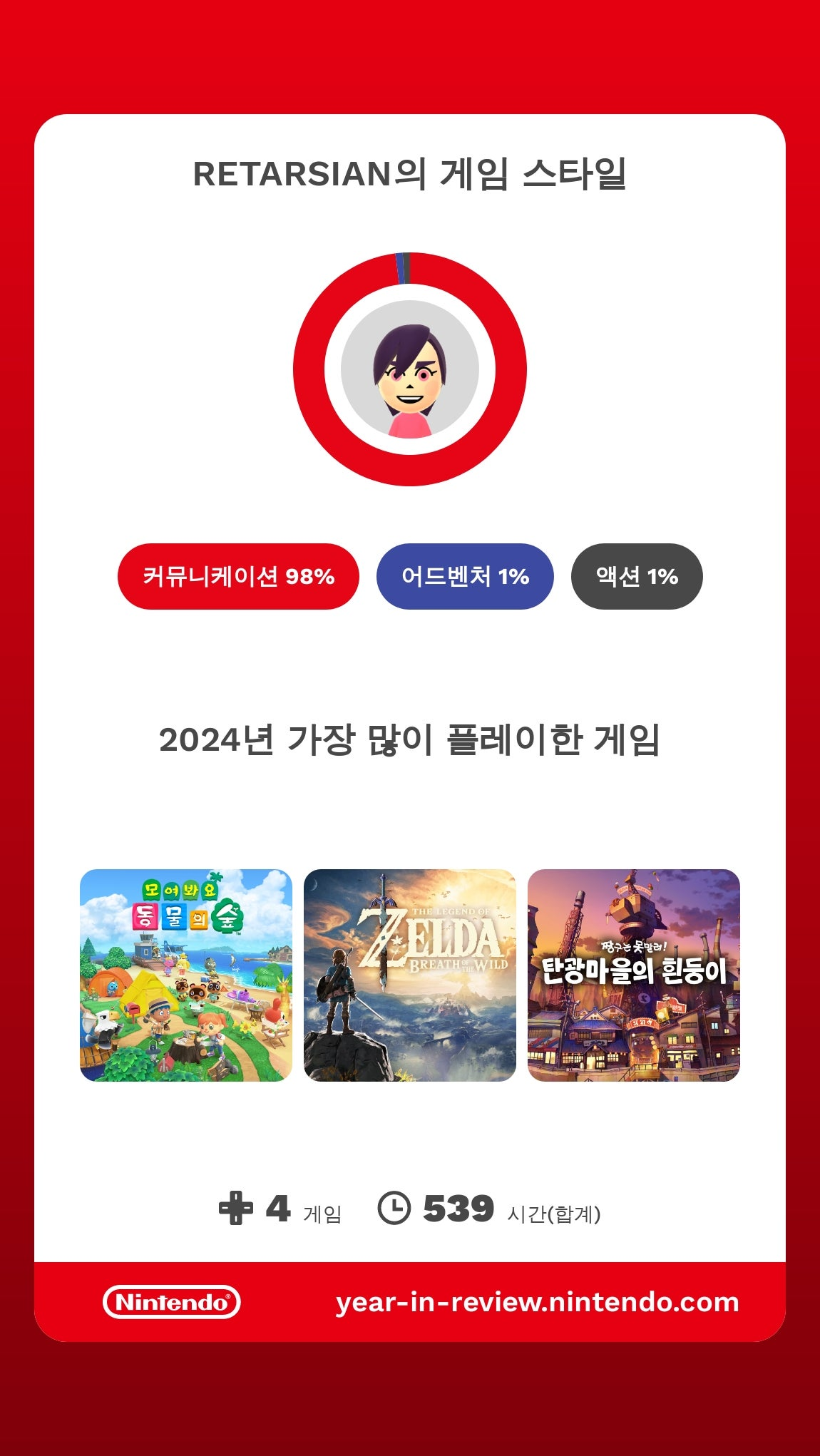 나는 올해 닌텐도 스위치로 총 4개의 게임을 539시간 플레이했다고 한다.